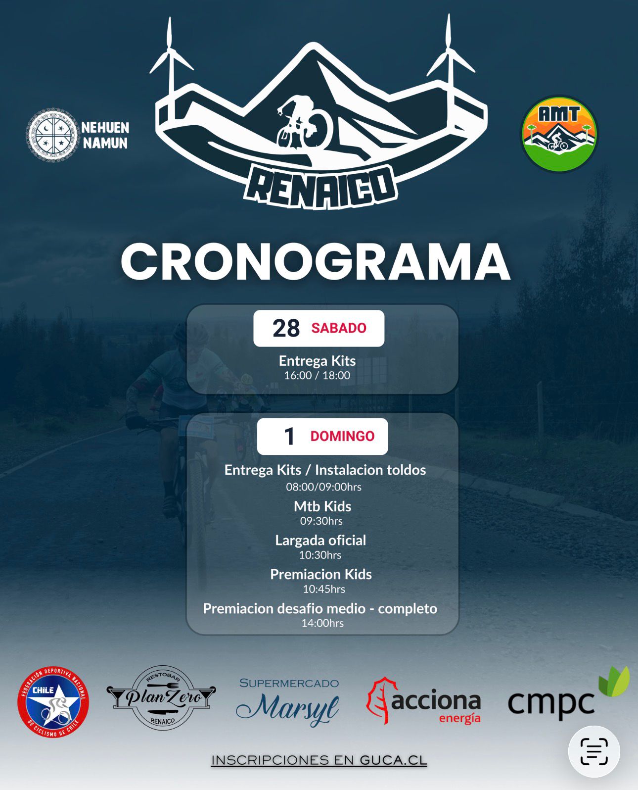 Tenemos el agrado de invitarlos a nuestro Campeonato modalidad Cross Country Marathon (XCM), el cual se desarrollará en nuestra Región de la Araucanía, en las comunas de Cherquenco, Renaico, Angol, Temuco, Pucón.