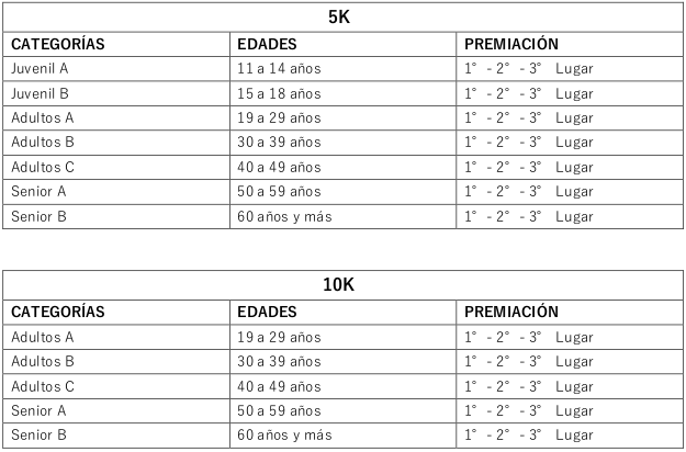 Se otorgará premios a los 3 primeros lugares de la general Damas/Varones en distancia 10K y medallas a los 3 primeros lugares por categoría en cada una de las distancias.
