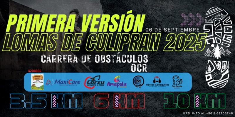 • Las inscripciones se harán online a través de la página www.guca.cl, directamente 1era VERSIÓN CARRERA RECREATIVA – LOMAS DE CULIPRAN OCR 2025” y a través de link de que podrán encontrar en nuestras redes sociales.