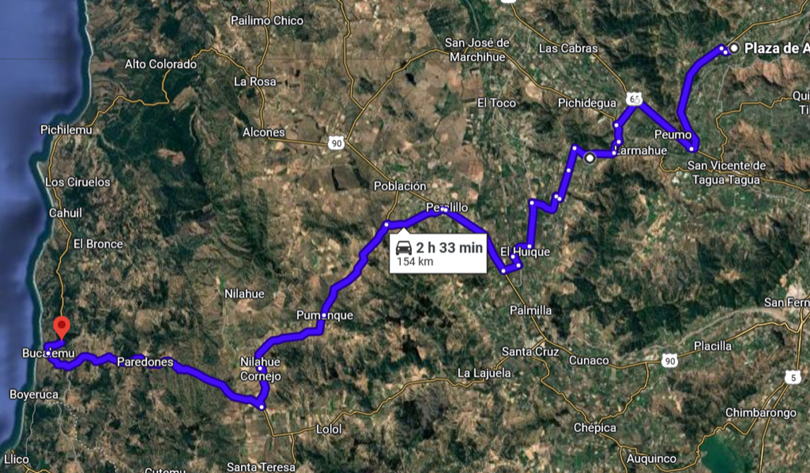 Salida plaza de Coltauco por H-372 Dirección sur para tomar H-30 hasta Ruta 66, Ruta 66 Dirección Pichidegua entrando por H-774 doblando en H-76 Y tomando H-82, CONTIUNAMOS Y DOBLAMOS A LA IZQUIERDA A LA RUTA l-330-h hasta llegar a la ruta l-332 donde tomaremos la ruta 90 dirección a la costa llegando a peralillo entraremos a la ruta l-690 y luego la l-60 dirección pumanque-Nilahue- Vichuquenctio donde conectaremos con la l-72 dirección paredores terminando en cuesta bucalemu.(km3)